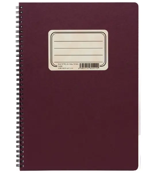 50 listů • boční spirálová vazba Twin Wire • bezdřevý bělený papír 70 g/m² • kašírované pevné desky v Retro designu • formát: A4 • typ: linkovaný