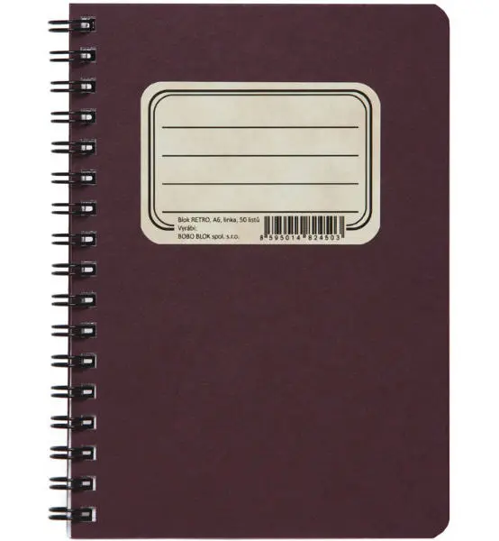 50 listů • boční spirálová vazba Twin Wire • bezdřevý bělený papír 70 g/m² • kašírované pevné desky v Retro designu • formát: A6 • typ: linkovaný