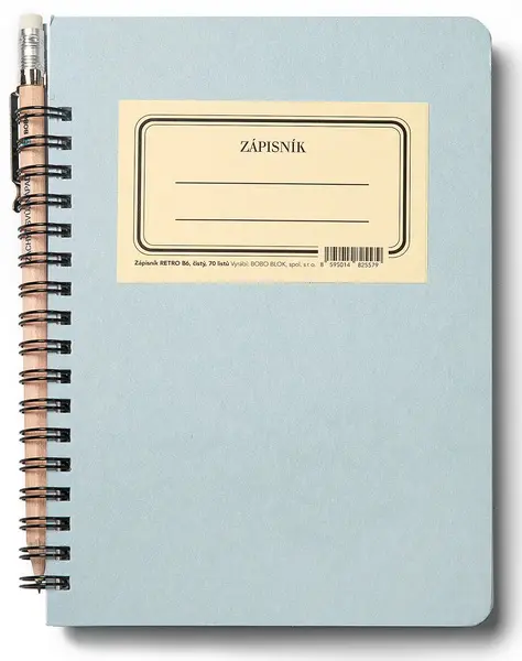formát B6 • 70 listů • boční spirálová vazba Twin Wire • bezdřevý bělený papír 70 g/m² • kašírované pevné desky v Retro designu • obyčejná tužka s gumou ve vazbě