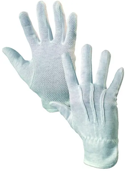 dlaň a prsty pokryty drobnými PVC terčíky • gumička v zápěstí • doporučené použití: manipulace s lehkými, nebo drobnými předměty • odvětví: logistika a skladování • barva bílá