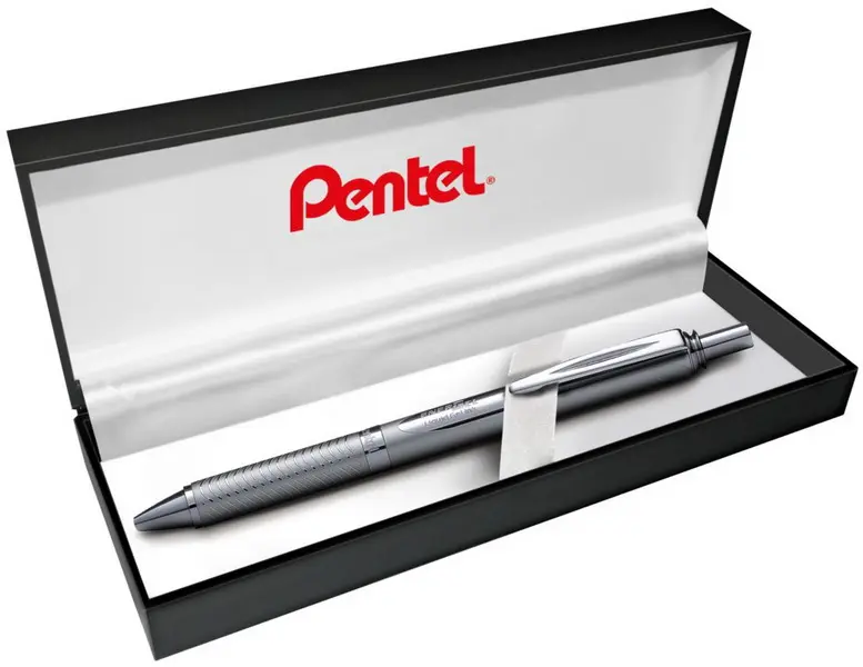 vyměnitelná náplň • stopa 0,7 mm • celokovové tělo • rychleschnoucí energelová náplň • černý inkoust • stiskací mechanismus • dárková krabička