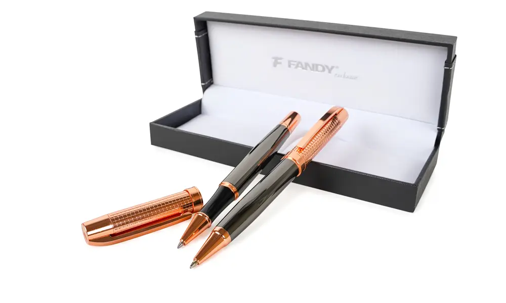 souprava kovového kuličkového pera a rolleru, kuličkové pero s otočným mechanismem, roller s víčkem, vyměnitelná náplň typ F-Parker, šíře stopy 0,7 mm (kuličkové pero), Ceramic, šíře stopy 0,5 mm (roller), modrý inkoust, luxusní dárková krabička