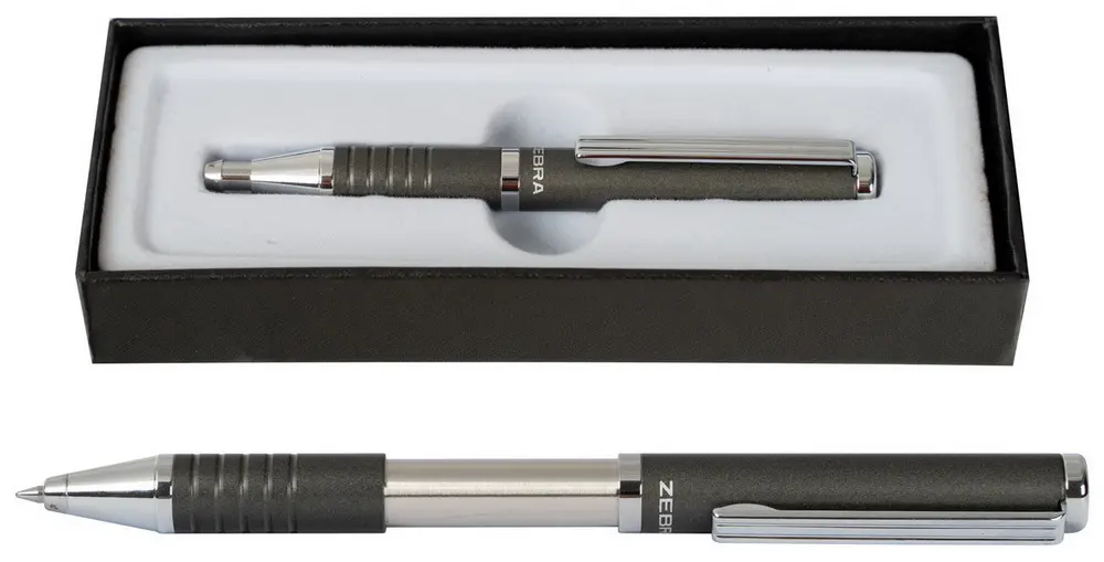 celokovové kuličkové pero, výsuvný mechanismus – ideální společník diáře, zápisníku, poznámkového bloku, vyměnitelná náplň F-0,7 Zebra, modrý inkoust, šíře stopy 0,7 mm, luxusní dárková krabička