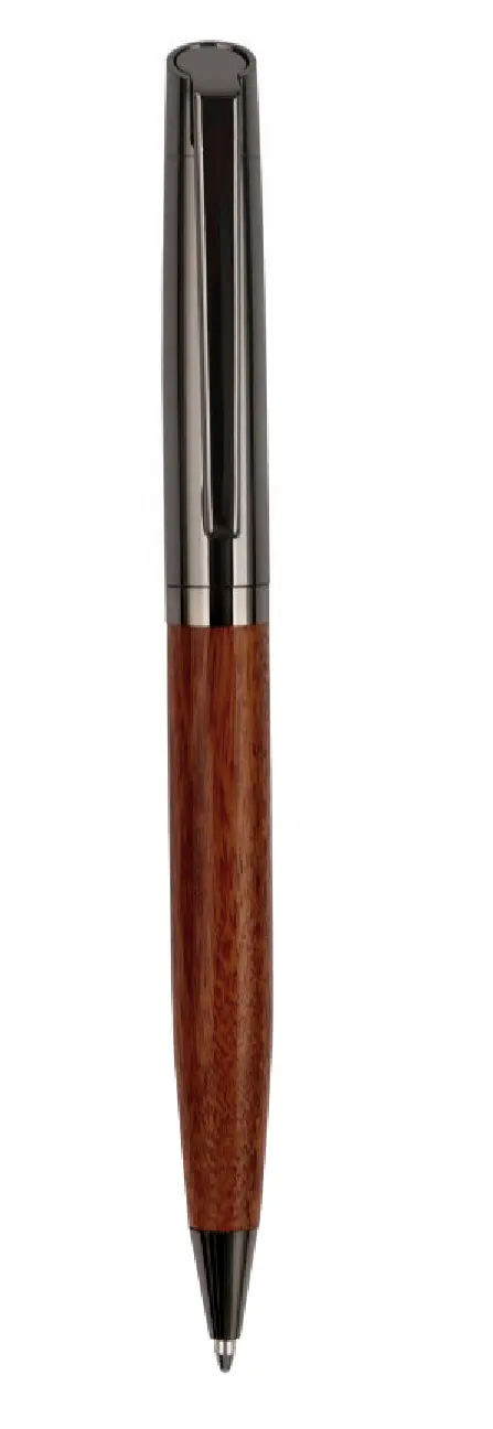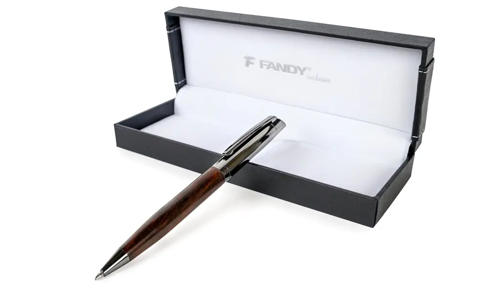 Kovové kuličkové pero v luxusní dárkové krabič e. Úchopová část ze dřeva, pero má otočný mechanismus a vyměnitelnou náplň typu F-Parker, šíří stopy 0,7 mm a modrým inkoustem.