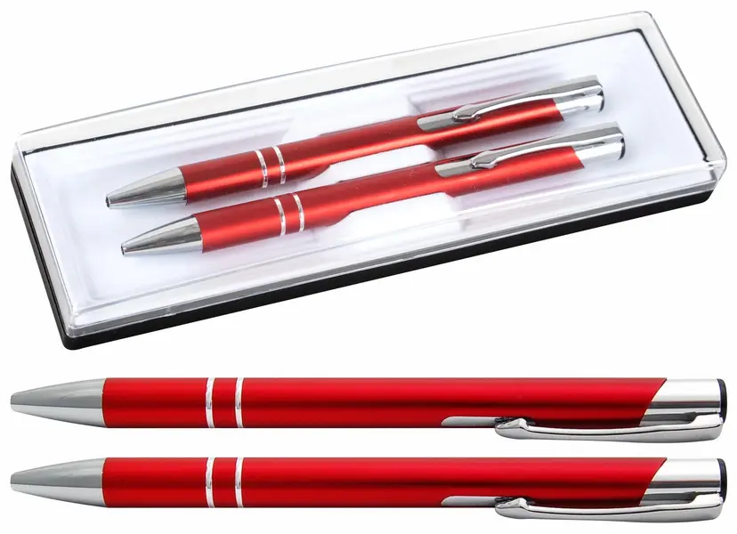souprava kovového kuličkového pera a automatické tužky, stiskací mechanismus, vyměnitelná náplň F-Parker, modrý inkoust, šíře stopy 0,7 mm (kuličkové pero), zasunovací hrot, tuha 0,5 mm (automatická tužka), dárková krabička