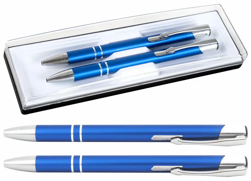 souprava kovového kuličkového pera a automatické tužky, stiskací mechanismus, vyměnitelná náplň F-Parker, modrý inkoust, šíře stopy 0,7 mm (kuličkové pero), zasunovací hrot, tuha 0,5 mm (automatická tužka), dárková krabička