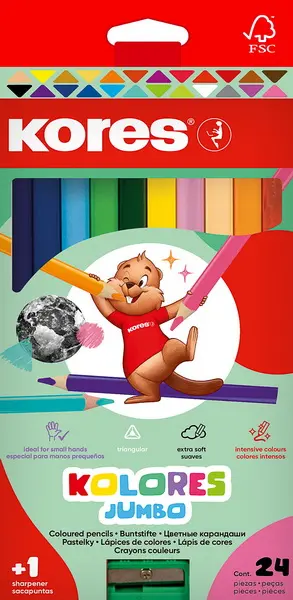 trojhranné • zářivé barvy díky vysokému obsahu pigmentu • z vysoce kvalitního lipového dřeva pro snadné ořezávání • ořezávátko v balení zdarma (kromě 401 107 a 402 029) • u provedení Jumbo je na pastelce políčko pro napsání jména • provedení: trojhranné Jumbo • počet ks: 24 barev