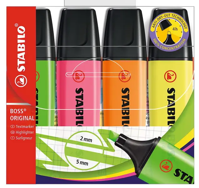 jedinečná designová klasika od roku 1971 v nových barvách • Anti-Dry-Out technologie: 4 hodiny ochrany proti vysychání • zkosený hrot v šíři 2 - 5 mm • 10 ks v balení • sada 15 ks obsahuje 9 fluorescenčních a 6 pastelových barev • sada 23 ks obsahuje