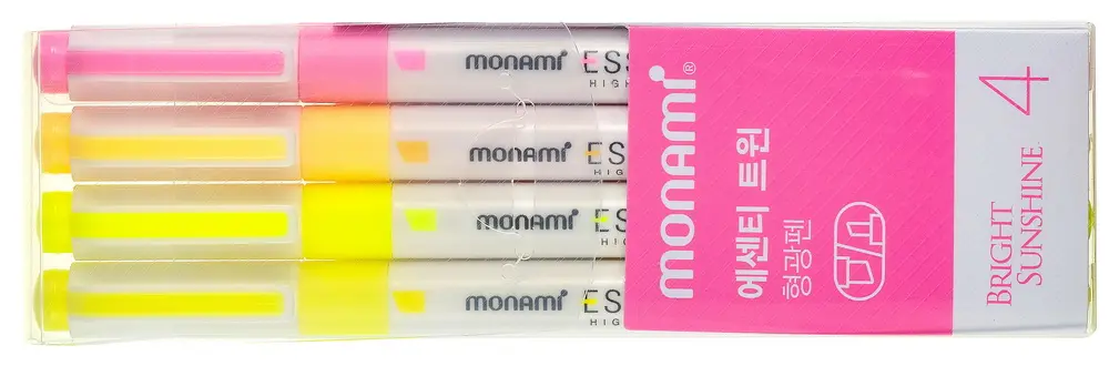 seříznutý hrot • 2 hroty: šíře 2 mm pro tenčí linie a šíře 4 mm pro širší zvýraznění zkosený• rychleschnoucí • perfektní pro zvýrazňování, podtrhávání nebo k psaní poznámek • nerozmazatelný inkoust • kulaté tělo • víčko s klipem • sada 4 barev