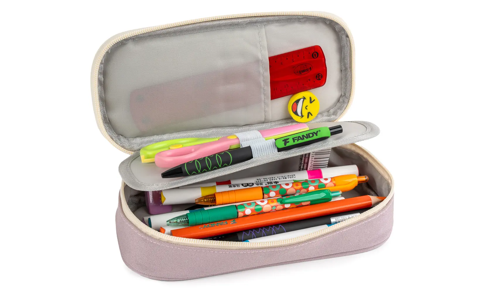 textilní etue se zipem a kapsičkou na cvok, omyvatelný povrch, rozměr penálu 21,5 x 9,5 x 5 cm