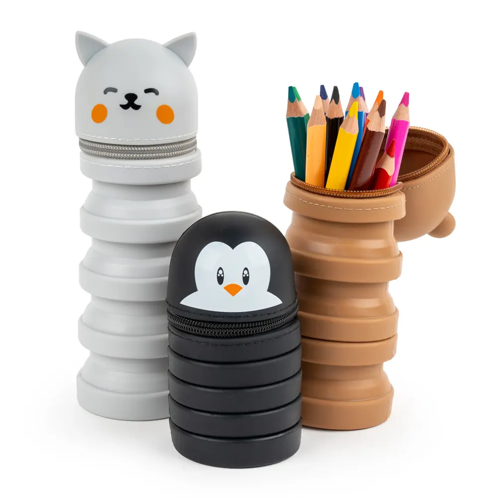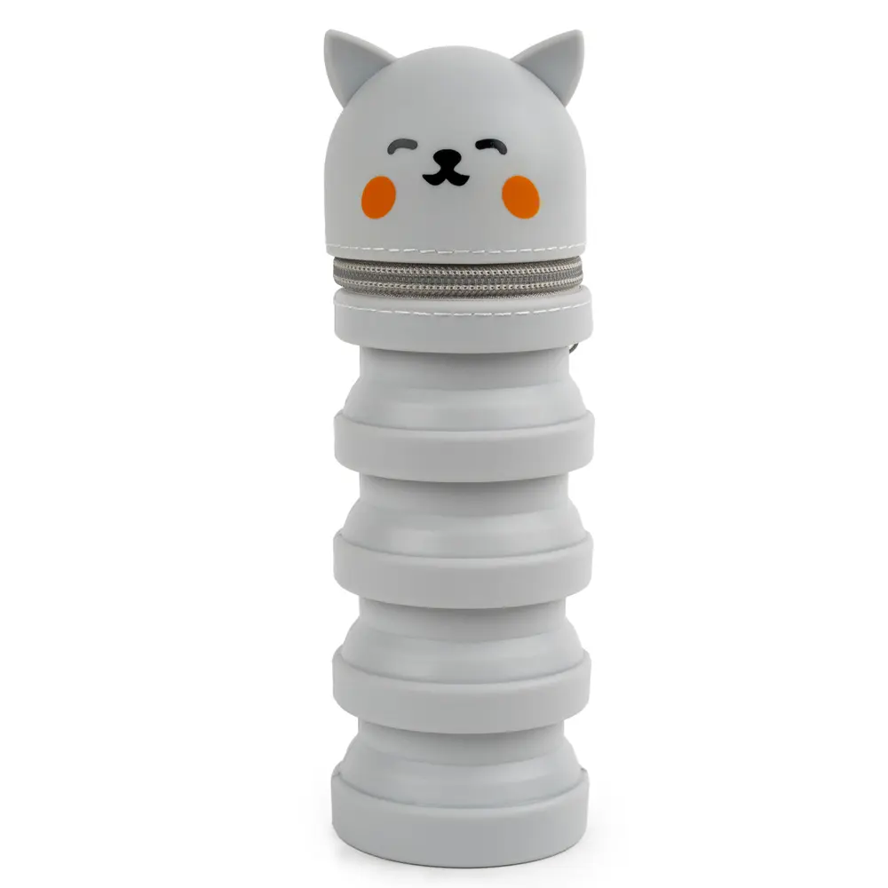 silikonový skládací penál, může sloužit jako stojánek na tužky, výška složeného penálu 12,5 cm, výška rozloženého 21 cm, průměr 6,5 cm