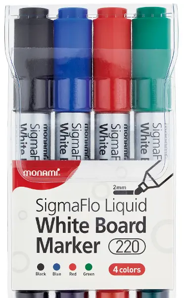 kulatý hrot • šíře stopy 2 mm • na bílé tabule • tekutý inkoust • k použití v horizontální i vertikální poloze • inkoust je spotřebován do poslední kapky • třikrát delší stopa i delší životnost při neuzavřeném popisovači v porovnání s tamponovými pop