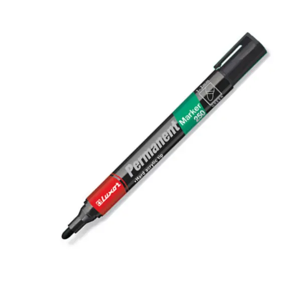permanentní • vláknový kulatý hrot • šíře stopy 2 - 3 mm, dle tlaku • víčko s klipem • bez xylenu a toluenu • bez zápachu • jednotlivě zabaleno do průhledné fólie • pro použití v interiéru i exteriéru • např. na dřevo, kov, sklo, plast, keramiku, kůž