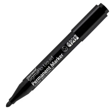 permanentní • kulatý hrot • šíře stopy 2 mm • tekutý inkoust na bázi alkoholu • extra dlouhá stopa • nesmyvatelný, voděodolný • rovnoměrná sytá stopa do poslední kapky inkoustu • např. na sklo, kov, dřevo, plast atd. • možné použití v horizontální i