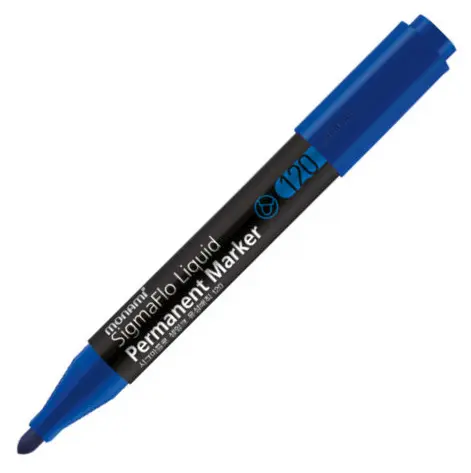 permanentní • kulatý hrot • šíře stopy 2 mm • tekutý inkoust na bázi alkoholu • extra dlouhá stopa • nesmyvatelný, voděodolný • rovnoměrná sytá stopa do poslední kapky inkoustu • např. na sklo, kov, dřevo, plast atd. • možné použití v horizontální i