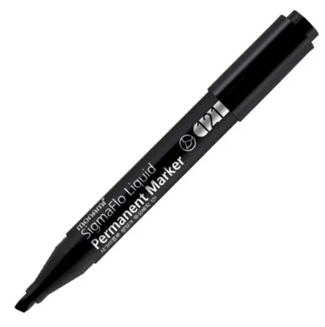 permanentní • klínový hrot • šíře stopy 1 - 5 mm • tekutý inkoust na bázi alkoholu • extra dlouhá stopa • nesmývatelný, voděodolný • rovnoměrná sytá stopa do poslední kapky inkoustu • např. na sklo, kov, dřevo, plast atd. • možné použití v horizontál