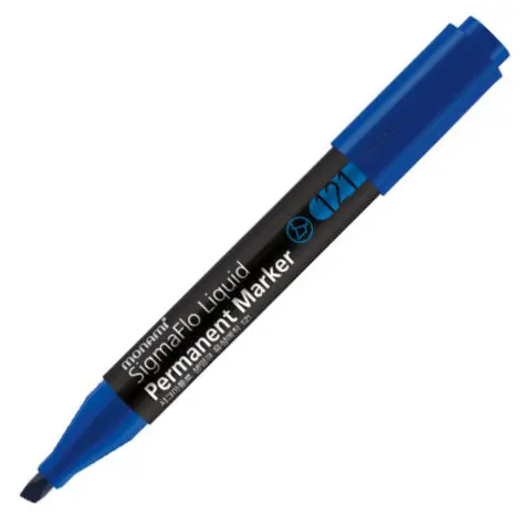 permanentní • klínový hrot • šíře stopy 1 - 5 mm • tekutý inkoust na bázi alkoholu • extra dlouhá stopa • nesmývatelný, voděodolný • rovnoměrná sytá stopa do poslední kapky inkoustu • např. na sklo, kov, dřevo, plast atd. • možné použití v horizontál