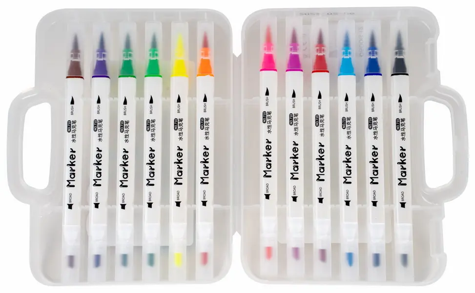 sada 12 kusů oboustranných popisovačů v elegantním plastovém kufříku s uchem, štětcový (3,2 mm) i zkosený (3,5 mm) hrot, zářivé barvy, čtvercový profil těla, inkoust na vodní bázi