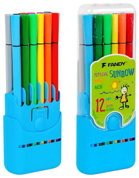 sada 12 barevných popisovačů v plastové krabičce, inkoust na vodní bázi, vypratelné z většiny běžných textilií, šíře stopy 1-2 mm, délka psaní cca 200 m