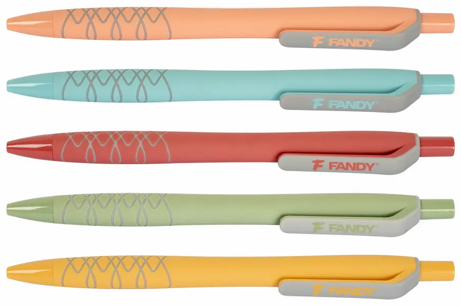 plastové kuličkové pero, stiskací mechanismus, pogumované tělo pro velmi příjemné v držení, vyměnitelná náplň F-411, modrý inkoust, šíře stopy 0,7 mm, mix barev