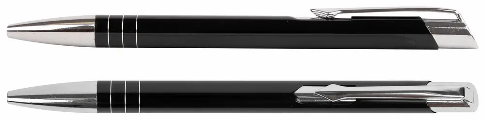 kovové kuličkové pero, stiskací mechanismus, vyměnitelná náplň F-Parker plast, modrý inkoust, šíře stopy 0,7 mm