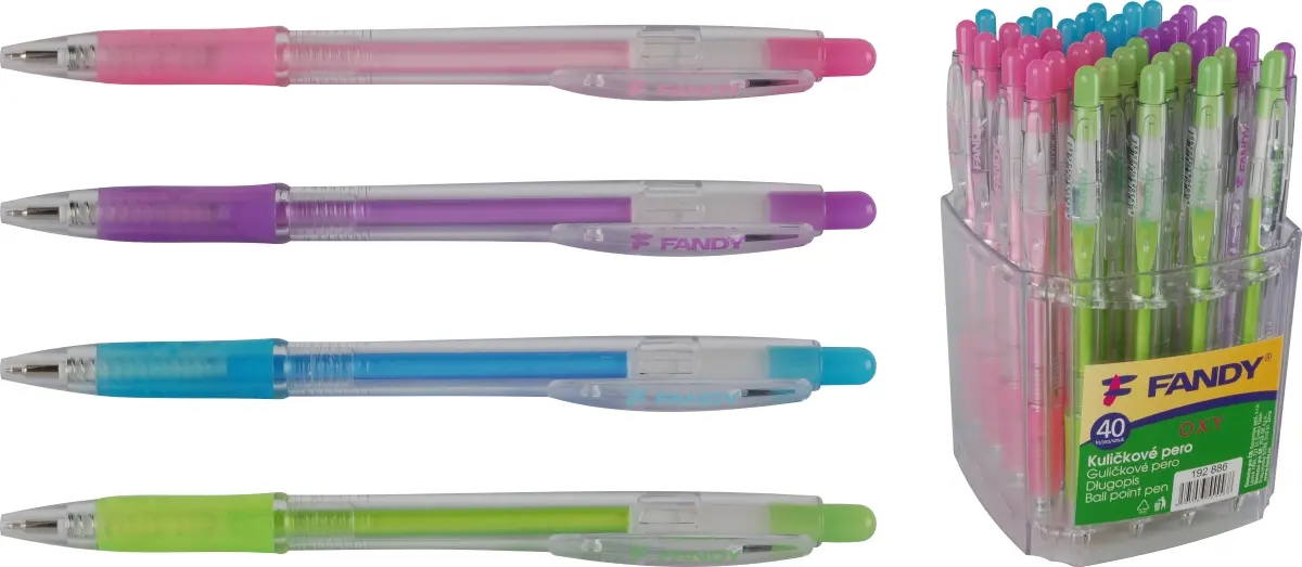plastové kuličkové pero, stiskací mechanismus, gumová úchopová část pro pohodlné držení, vyměnitelná náplň F-411, jehlový hrot pro extra tenké psaní, modrý inkoust, šíře stopy 0,5 mm, mix barev