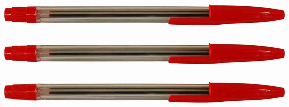 plastové kuličkové pero, jednorázové, průhledné tělo, červený inkoust, šíře stopy 0,7 mm