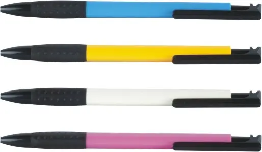 plastové kuličkové pero, stiskací mechanismus, gumová úchopová část pro pohodlné držení, vyměnitelná náplň F-411, modrý inkoust, šíře stopy 0,7 mm, mix barev