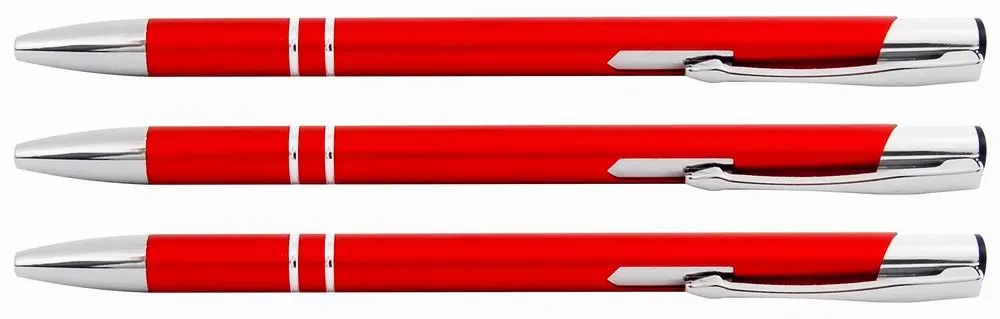 kovové kuličkové pero, stiskací mechanismus, stříbrné doplňky, vyměnitelná náplň F-411, modrý inkoust, šíře stopy 0,7 mm