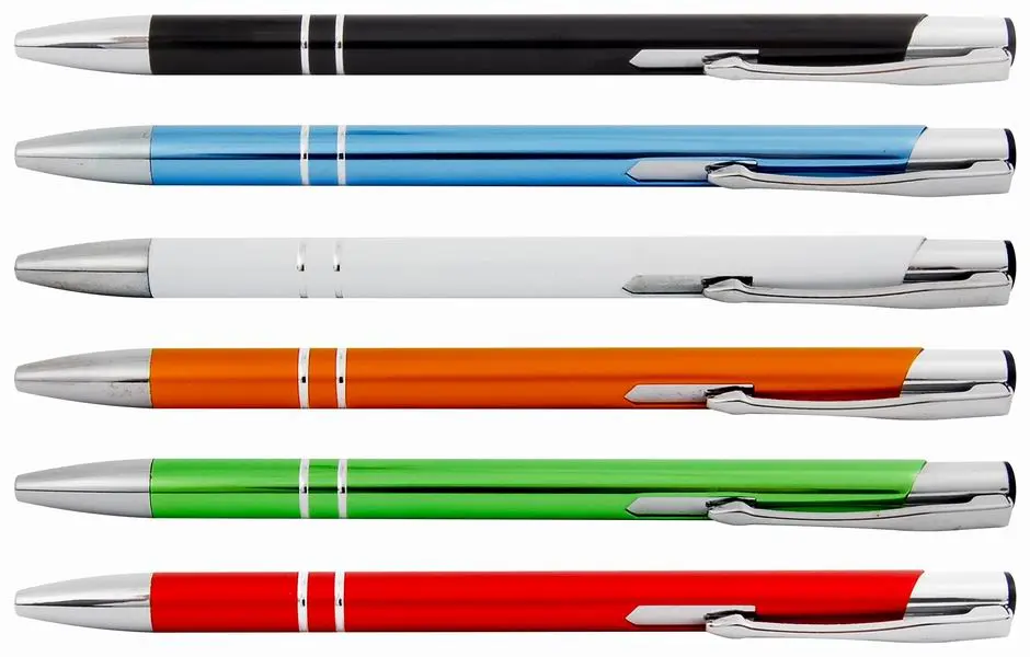 kovové kuličkové pero, stiskací mechanismus, stříbrné doplňky, vyměnitelná náplň F-411, modrý inkoust, šíře stopy 0,7 mm, mix barev