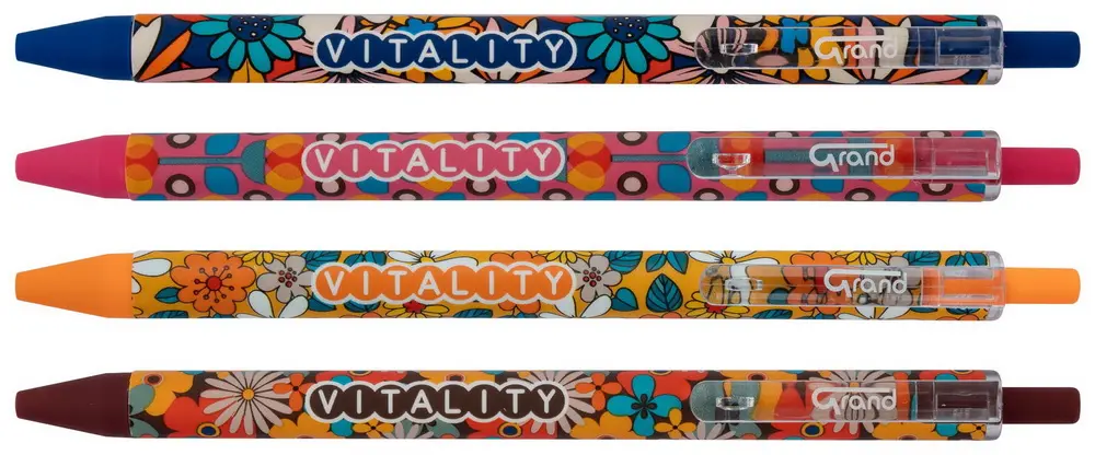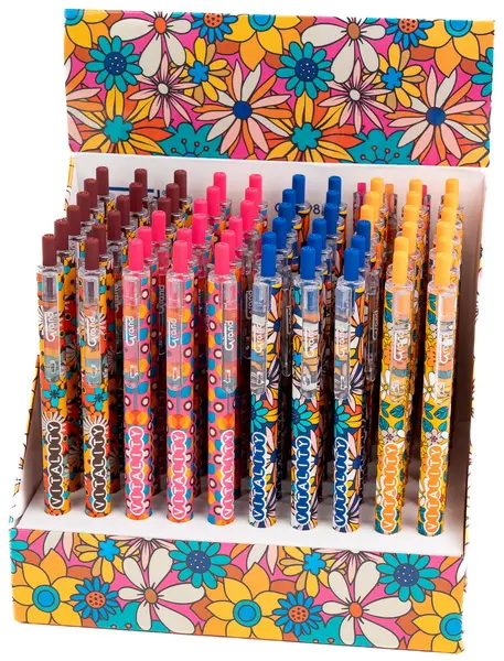 plastové kuličkové pero, stiskací mechanismus, květinový vzor, vyměnitelná náplň F-411, modrý inkoust semi-gel pro příjemné psaní, šíře stopy 0,5 mm, jehlový hrot, mix barev