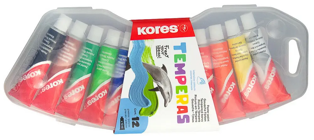 vysoká krycí schopnost • snadno míchatelná a ředitelná vodou • ideální do školy i pro volný čas • lze použít na papír, karton a plátno • hliníková tuba 12 ml • sada 12 ks v obalu, který možno použít jako paletu