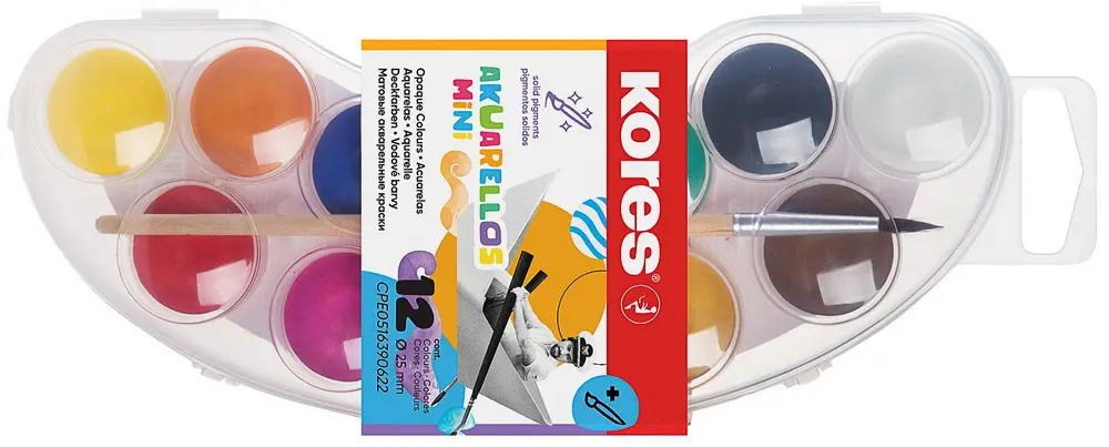 12 intenzivních a zářivých barev s vysokou krycí schopností • ideální do školy i pro volný čas • snadno míchatelné barvy • unikátní design – obal lze uchopit jako malířskou paletu • praktické víčko s plochou pro míchání jednotlivých barev • omyvateln