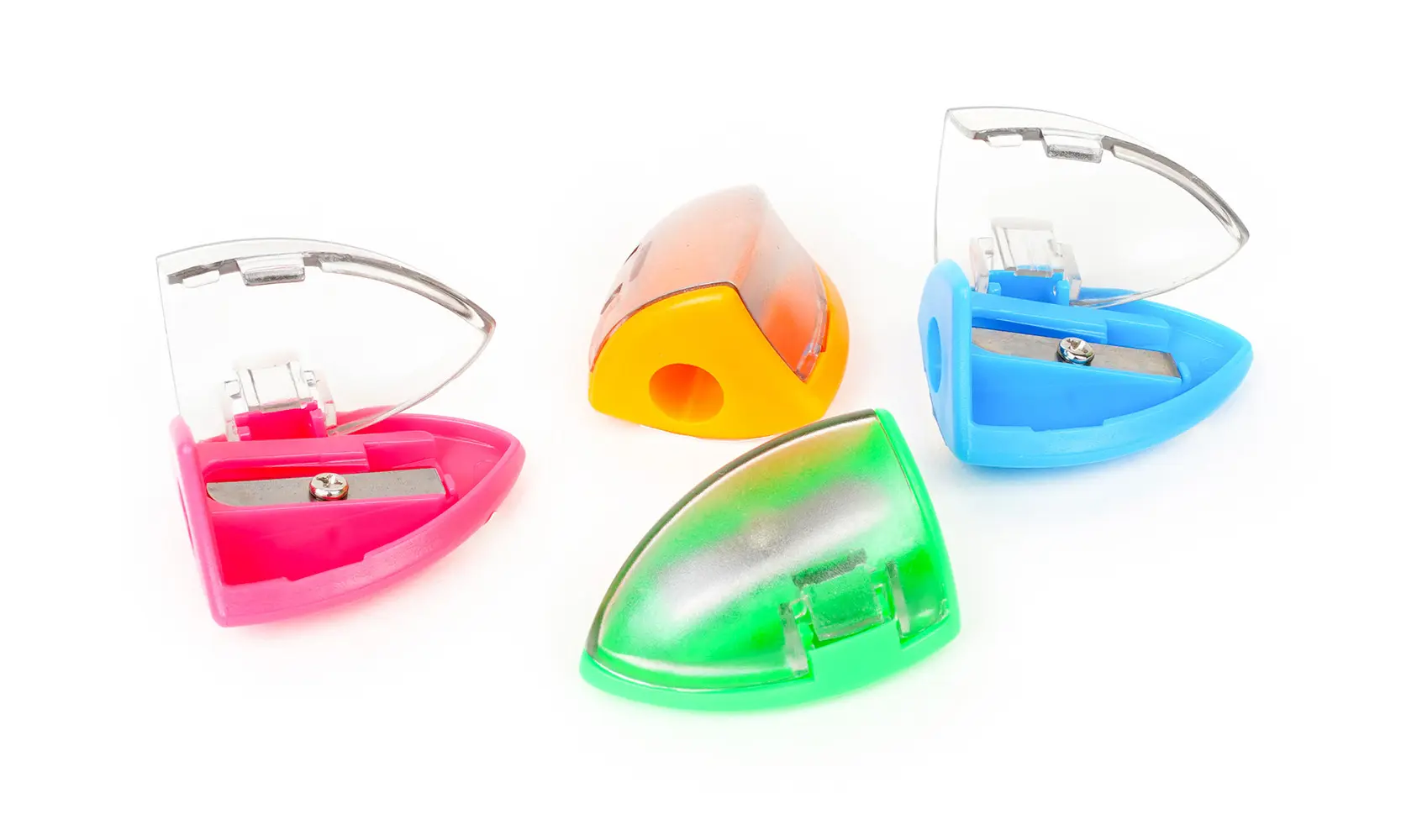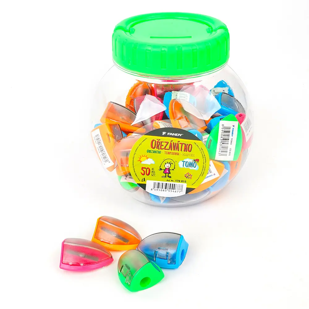 plastové ořezávátko s gumovým úchytem a zásobníkem na odpad, vhodné do penálu, barevně nadružené v PVC dóze, 50 ks v balení