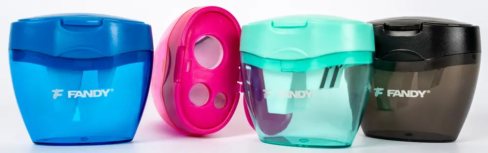 plastové ořezávátko pro ořezávání tenkých (8 mm), silných (11 mm) a extra silných (16 mm) tužek s velkým zásobníkem na odpad a víčkem, rozměr cca 6 x 5,5 x 3 cm
