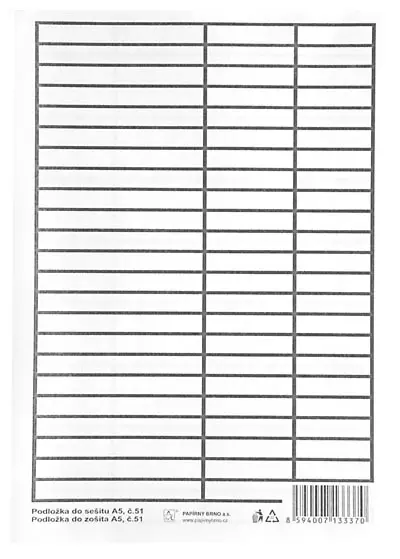 podložka do sešitu, tzv. lenoch • papírové - 250 ks v balení • PVC - 100 ks v balení • materiál: papír • formát: A5 • provedení: linka - čtvereček