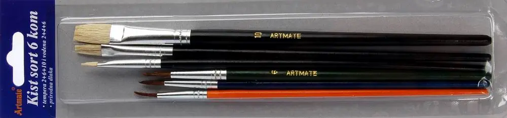 sada 3 kulatých štětců na temperové barvy, vel. 2,6,10 a 3 plochých štěteců na vodové barvy, vel. 2,4,6, přírodní vlas, dřevěná rukojeť, kovové kování