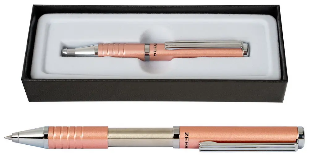 celokovové kuličkové pero, výsuvný mechanismus – ideální společník diáře, zápisníku, poznámkového bloku, vyměnitelná náplň F-0,7 Zebra, modrý inkoust, šíře stopy 0,7 mm, luxusní dárková krabička