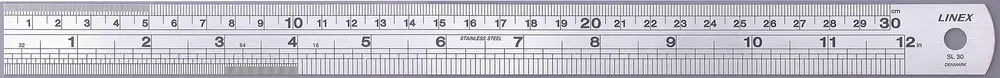 nerezová ocel • měřítko v cm na jedné hraně a v palcích na protější • převodní tabulky na zadní straně